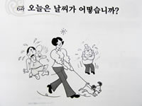 「今日の天気はどうです?」 オヌルン ナルシガ オットスムニカ? などわかりやすいテキストを使って基礎的なハングルの勉強をしています。